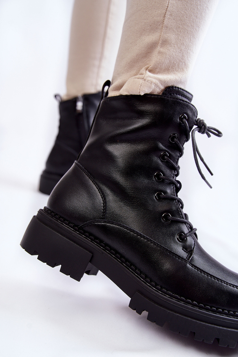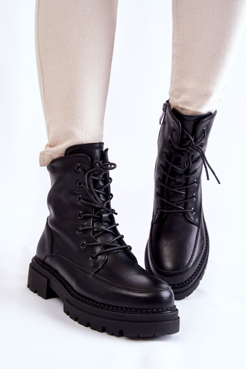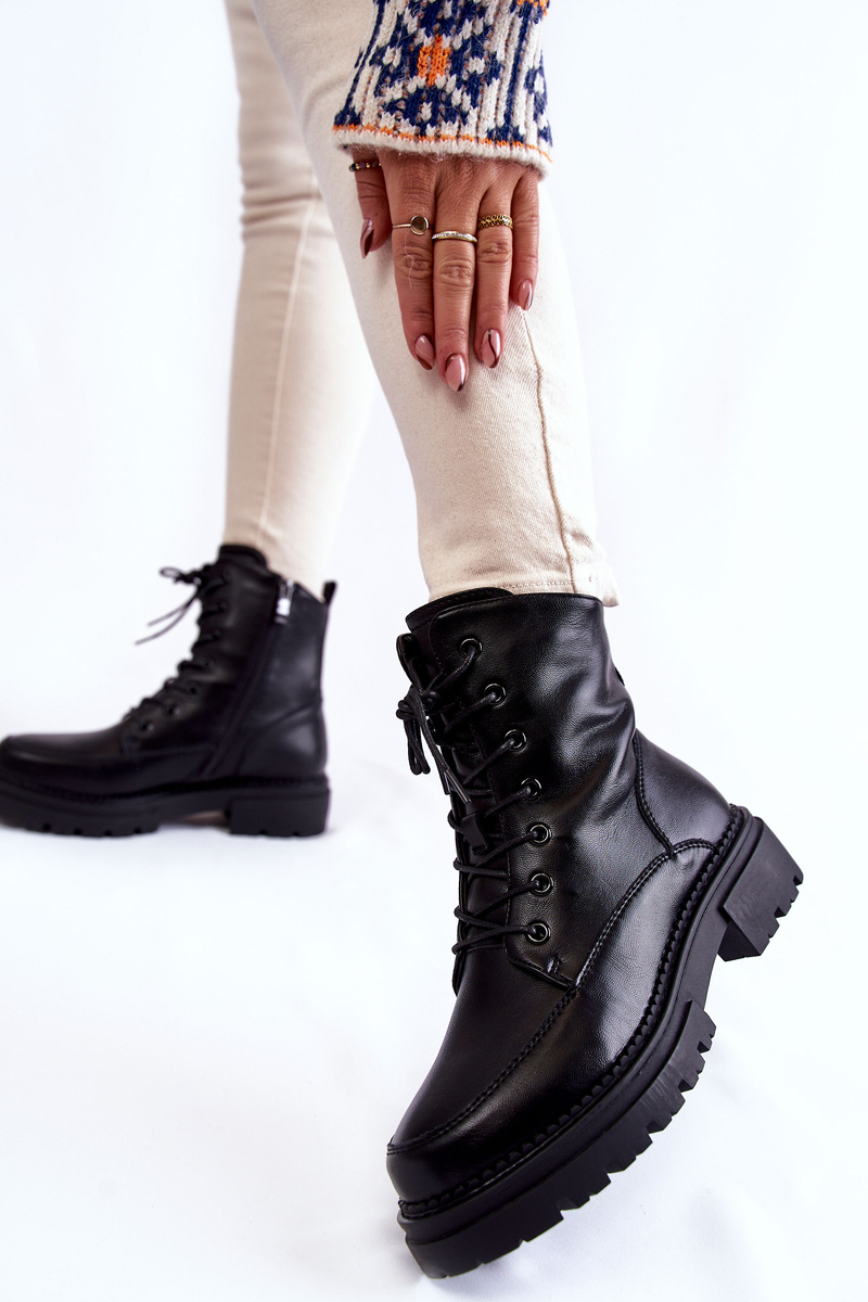 Класичні жіночі чоботи збагачені декоративною вставкою на задній частині верху. Виготовлений з натуральної шкіри. Ці черевики мають внутрішню ізоляцію у вигляді приємного на дотик черевика. Застібається на блискавку і шнурується. Вони кріпляться на плоскій каблук і платформу з канавками. Підборник посилений. Ідеально підходить для багатьох стилів. При виборі розміру скористайтеся таблицею розмірів.