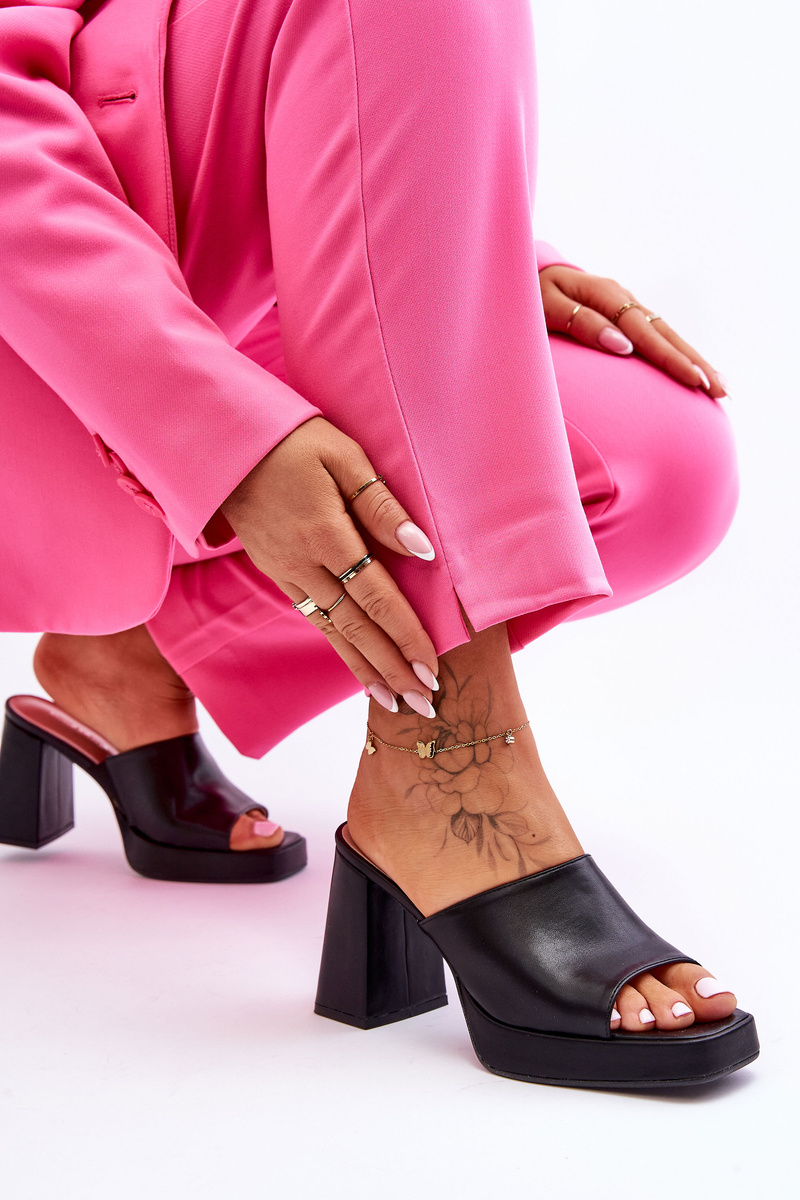 Класичні жіночі тапочки встановлені на каблуці у вигляді масивного стовпа. Виготовлений повністю з еко шкіри. Зсередини мають еластичну стрічку, яка дозволить правильно підібрати взуття по довжині ноги. М'яка устілка забезпечить комфортне використання взуття навіть протягом дня. Класичний крій з відкритим квадратним носком. Обираючи розмір, орієнтуйтеся на таблицю розмірів.