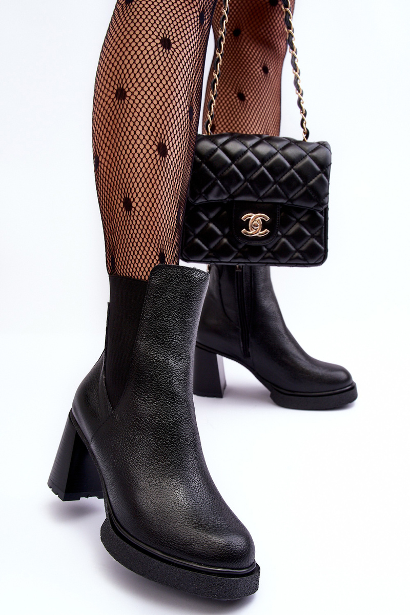 Черевики на платформі та каблуці у вигляді стовпчика. Верхня до щиколотки. Виготовлений з натуральної шкіри. Зверху еластична вставка. Застібається на блискавку з внутрішньої сторони. Взуття утеплено взуттєвою ковдрою. Підошва антиковзаюча. Черевики ідеально підійдуть до осіннього образу. При виборі розміру орієнтуйтеся на таблицю розмірів.