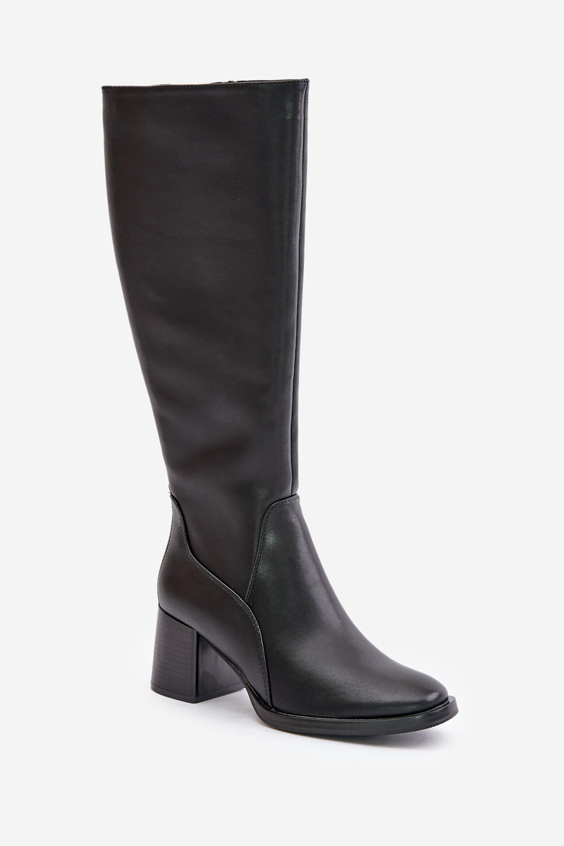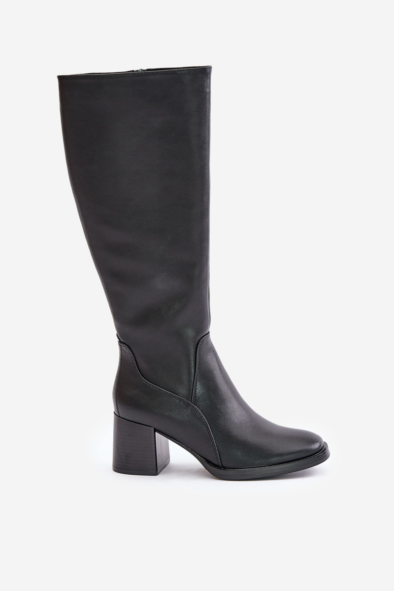Елегантні шкіряні чоботи до коліна — відмінний вибір для прохолодних днів. Виготовлений з високоякісної шкіри, утеплений салон забезпечує тепло і комфорт. Модель застібається на блискавку для зручного носіння, а стійкий каблук додає стильний акцент силуету. Заокруглені пальці. Ця модель ідеально підходить для елегантного стилю. Обираючи розмір, орієнтуйтеся на таблицю розмірів.