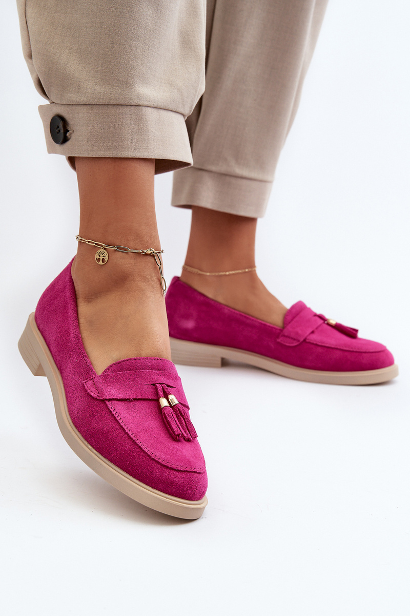 Жіночі мокасини з натуральної замші, характеризуються плоскою каблуком, що забезпечує стійкість під час ходьби. Спереду прикрашена ніжною бахромою, яка додає витонченості та стилю. Профільована устілка забезпечує додатковий комфорт при тривалому носінні. Це ідеальний вибір для тих, хто цінує як модний вигляд, так і зручність. Обираючи розмір, орієнтуйтеся на таблицю розмірів.