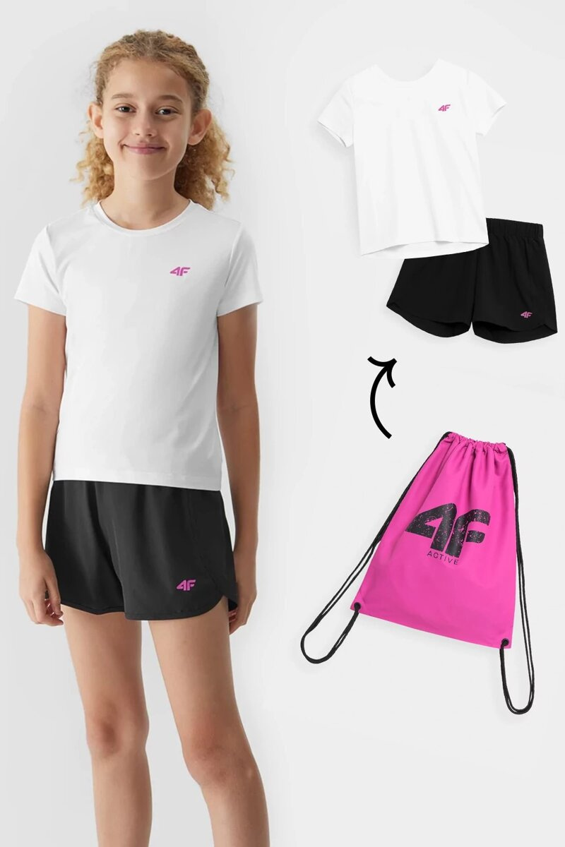 Спортивний комплект для фізкультури (футболка + шорти + сумка) для дівчинки. Складається зі зручної футболки, шортів і сумки для спортивного одягу та аксесуарів. Ідеально підходить для різноманітних видів спорту, таких як уроки фізкультури.