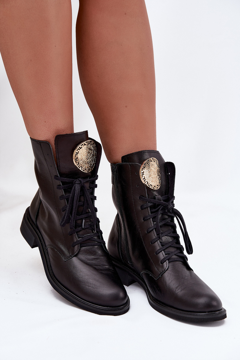 Жіночі чоботи з натуральної шкіри поєднують класичний і сучасний вигляд. Розташовані на плоскому підборі, вони забезпечують комфорт і стабільність протягом усього дня. Шнурівка дозволяє ідеально підганяти, а додатковий блискавка полегшує одягання. На язичку є золотий деталь, що додає елегантності. Ці чоботи чудово поєднуються з різними стилями, поєднуючи комфорт із модним акцентом. При виборі розміру, будь ласка, орієнтуйтеся на таблицю розмірів. Будь ласка, зверніться до розмірної сітки при виборі розміру.